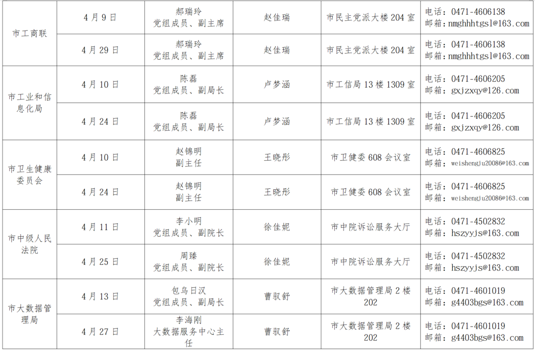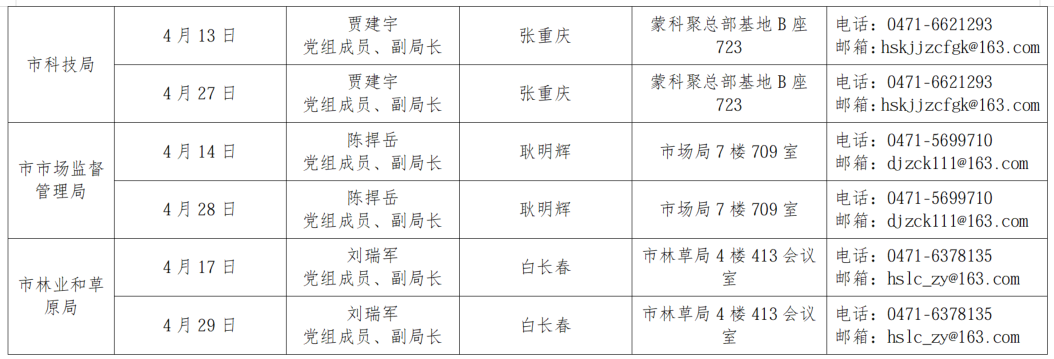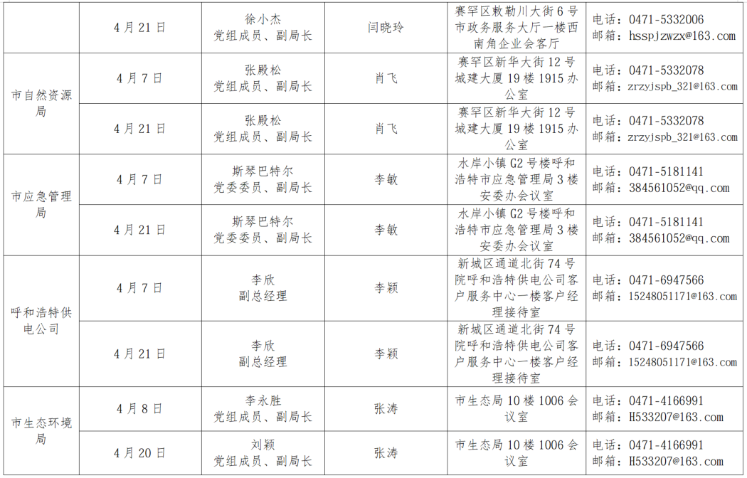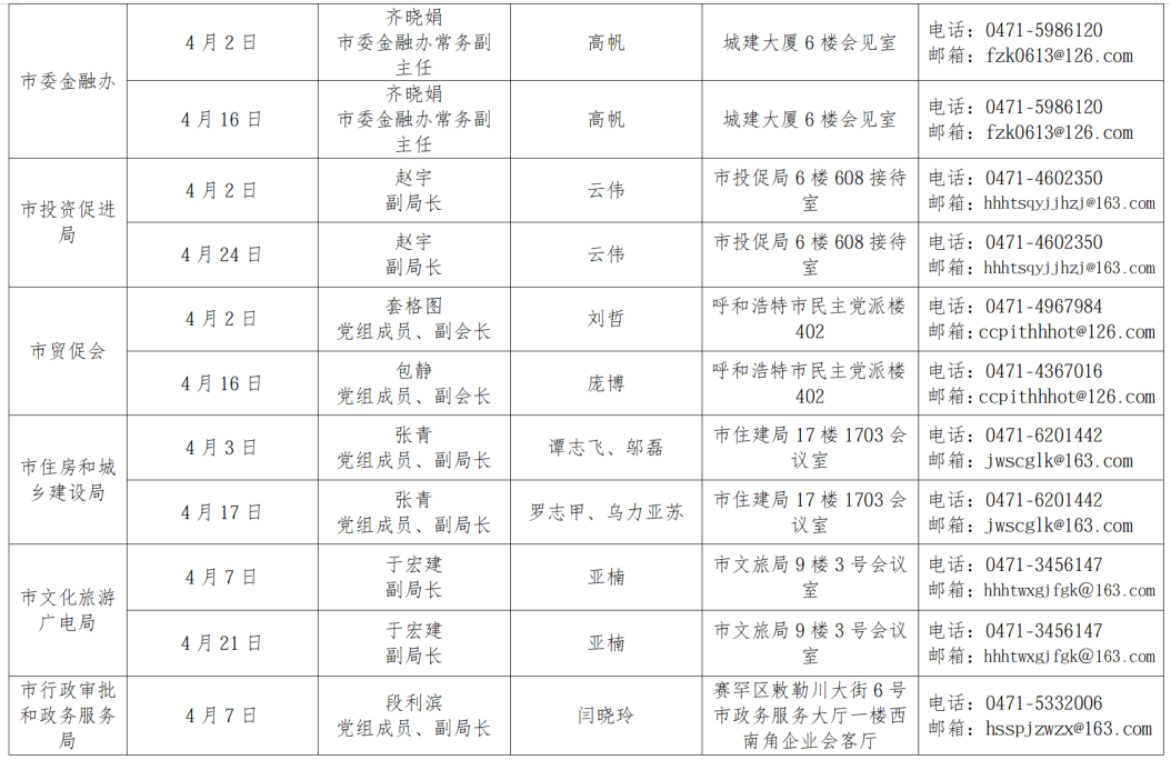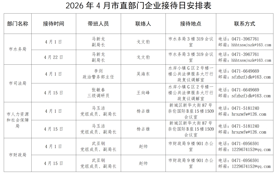 为畅通政企沟通渠道,切实为企业解难题、办实事,呼和浩特市市直相关部门自2026年3月起,每半月安排一次企业接待日,现场面对面为企业答疑解惑,精准对接企业服务需求,助力企业不断发展壮大,欢迎广大企业积极参与。按照工作安排,现将2026年4月市直部门企业接待日安排公告如下: