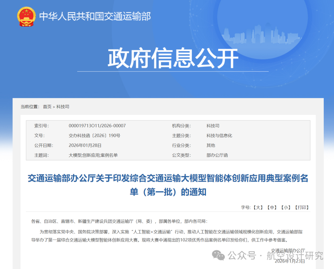 1月28日,交通运输部办公厅正式发布《综合交通运输大模型智能体创新应用典型案例名单(第一批)》,涵盖技术创新、运营服务、安全监管、政务管理四大类共102项典型案例。其中不乏低空相关应用场景案例,包括低空交通运输陆空协同领域中巡查巡检业务的图像识别研判,公路“空地一体”综合联巡大模型智能体,基于无人机巡检的空天地协同道路智能感知与主动防控系统,面向桥梁的“天—空—地—海”协同智能巡检与评估诊断智能体,无人机智能识别与协同应用系统,“千帆智瞰”CCTV+无人机智能视频监控平台。