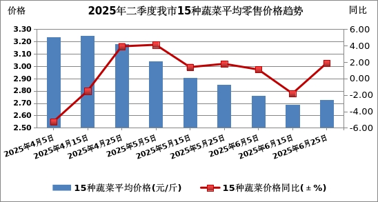 2025年二季度,在监测的15种蔬菜平均零售价格为2.96元/斤,季环比下降17.09%。15种蔬菜中有14个品种价格下降,1个品种价格上涨。