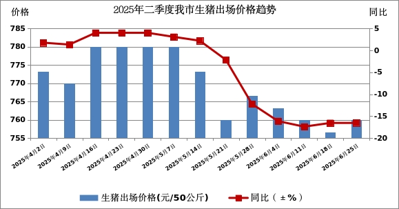 2025年二季度我市生猪平均出场价格为769.49元/50公斤(7.69元/斤),季环比下降4.06%,同比下降5.52%,猪粮比6.89:1。