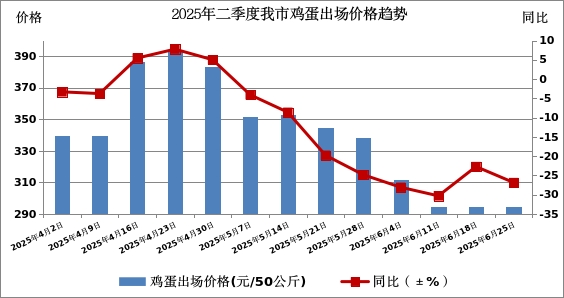 2025年二季度我市鸡蛋平均出场价格为340.64元/50公斤(3.41元/斤),季环比下降13.58%,同比下降12.86%。