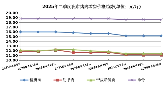 2025年二季度,我市猪肉零售价格呈下降趋势,其中猪肉精瘦肉、肋条肉、后腿肉、排骨零售价格分别为15.60元/斤、11.60元/斤、11.82元/斤、18.68元/斤,季环比分别下降5.51%、6.07%、8.09%、5.85%。