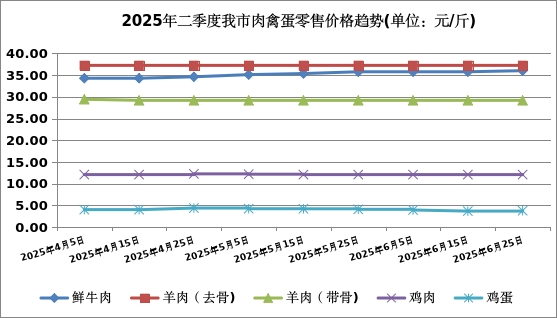 与2024年同期相比,牛肉、羊肉(去骨)、羊肉(带骨)、鸡肉、鸡蛋零售价格分别下降9.18%、4.83%、6.34%、6.25%、10.96%。