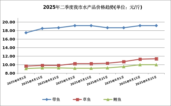 2025年二季度,带鱼、草鱼、鲤鱼零售价格分别为18.73元/斤、10.39元/斤、9.41元/斤,季环比分别上涨6.42%、9.95%、6.57%。