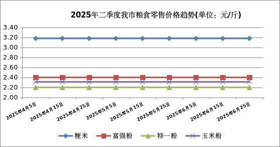 粳米、富强粉、特一粉、玉米粉零售价格分别为3.18元/斤、2.40元/斤、2.20元/斤、2.31元/斤,季环比持平。
