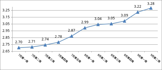 监测的15种蔬菜周平均零售价格为3.28元/斤,比上周上涨0.06元/斤,涨幅1.86%。15种蔬菜中,10个品种价格上涨,4个品种价格下降,1个品种价格持平。