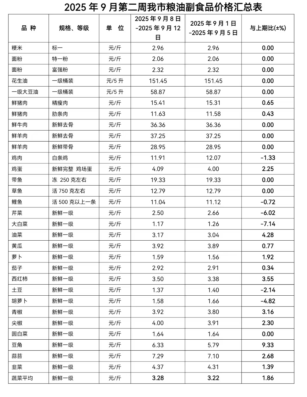 粳米、特一粉、富强粉周平均零售价格分别为2.96元/斤、2.06元/斤、2.32元/斤,与上周持平。