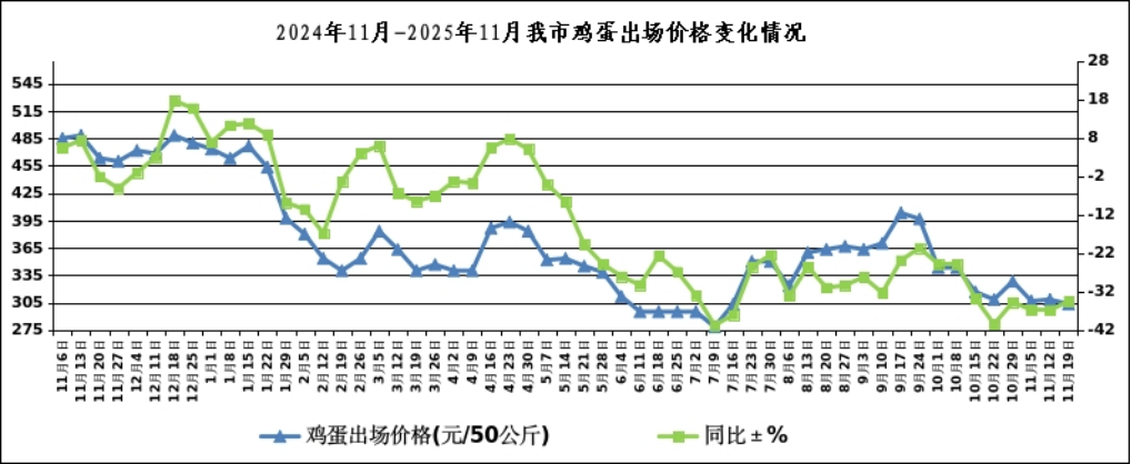 本周我市鸡蛋出场价格为303.33元/50公斤(3.03元/斤),比上周下降1.62%,同比下降34.53%。