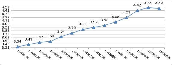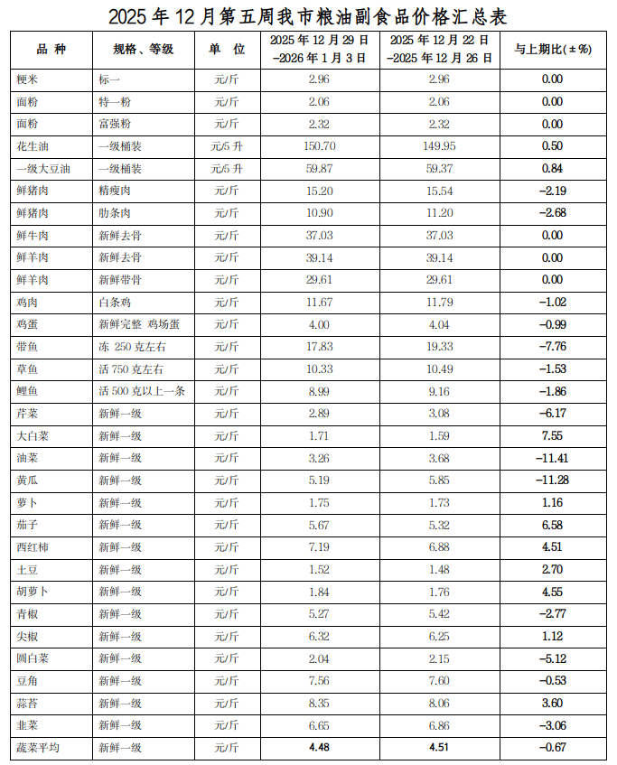 呼和浩特市价格认证监测中心对市场监测数据显示,本周我市蔬菜、猪肉、鸡肉、鸡蛋、水产品零售价格呈下降趋势,食用油零售价格呈上涨趋势,其他粮油副食品零售价格基本稳定。