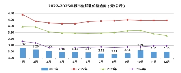 呼和浩特市价格认证监测中心对生鲜乳收购价格监测数据显示,2025年12月份我市生鲜乳平均收购价格为3.19元/公斤,与上月的3.19元/公斤持平,比2024年12月的3.38元/公斤下降5.62%。