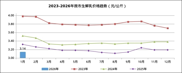 呼和浩特市价格认证监测中心对生鲜乳收购价格监测数据显示,2026年1月份我市生鲜乳平均收购价格为3.14元/公斤,月环比下降1.57%,同比下降5.42%。