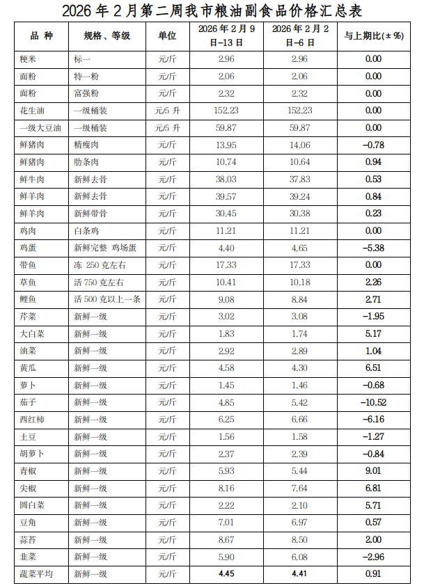 粳米、特一粉、富强粉周平均零售价格分别为2.96元/斤、2.06元/斤、2.32元/斤,与上周持平。