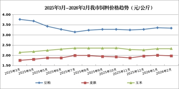 2026年2月,豆粕、麦麸价格分别为3.33元/公斤、1.97元/公斤,月环比分别下降0.35%、1.34%,玉米价格为2.33元/公斤,月环比上涨0.54%。