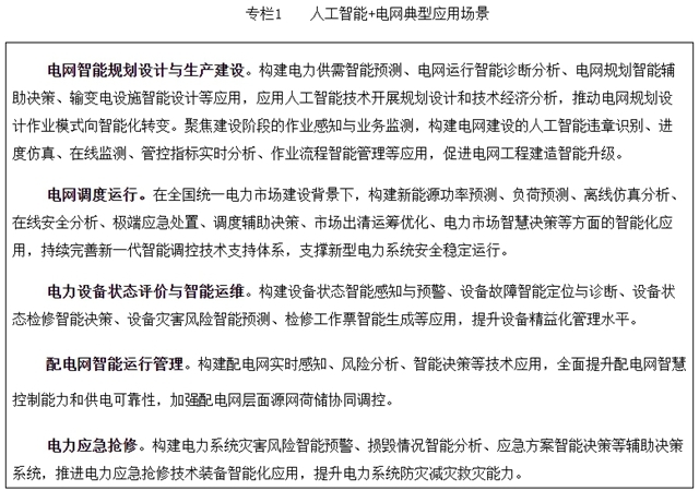 (一)人工智能+电网。围绕新型电力系统下的电网安全、新能源消纳、运行效率等要求,开展电力供需预测、电网智能诊断分析、规划方案智能生成等电网规划设计应用,加强电网工程智慧建设管理;推进电网多尺度智能仿真分析,探索人工智能模型在电网智能辅助决策和调度控制方面的应用,提升电力系统源网荷储全要素安全可靠低碳运行水平;稳步提高输变电等关键装备研制智能化水平;推动电力设备故障预测性维护,打造具备自主感知、决策、执行能力的电力设备健康管理智能体,提升设备精益化管理水平;推动营配调智能一体化应用,构建电网运营服务智能支撑体系,提升电力客户全过程智能服务水平;促进人工智能技术融入电力应急体系和能力建设,提升电力系统防灾减灾救灾智能化水平。