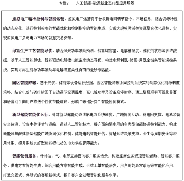 (二)人工智能+能源新业态。围绕能源保供和绿色低碳转型需求,推进人工智能技术在虚拟电厂(含负荷聚合商)、分布式储能、电动汽车车网互动等灵活性调节资源中的应用,提升负荷侧群控优化和动态响应能力;加强人工智能技术在新型储能与电力系统协同优化调度以及全生命周期安全中的应用,推动可再生能源制氢生产工艺智能寻优。强化人工智能技术赋能能源生产过程中的节能和碳排放管理,提升多能互补综合能源系统电、热、冷、气联供的综合能效和降碳水平。推动人工智能在零碳园区、智能微电网、算电协同中的应用,提升源网荷储一体化智能运行水平,促进新能源就地消纳。
