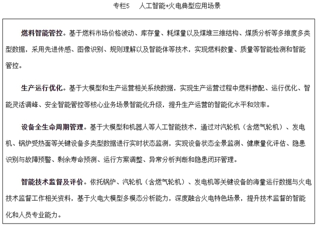 (五)人工智能+火电。围绕火电清洁降碳、安全可靠、高效调节、智能运行的发展方向,在燃料管控、生产运行优化与智能控制、设备全生命周期管理等业务场景,协同开展人工智能赋能及技术创新。加快火电数字化设计建造和智能化升级,推动火电运行控制系统智能化发展和应用,提升火电关键装备全生命周期智能监测及健康管理能力,助力火电支撑保障能力进一步提升。