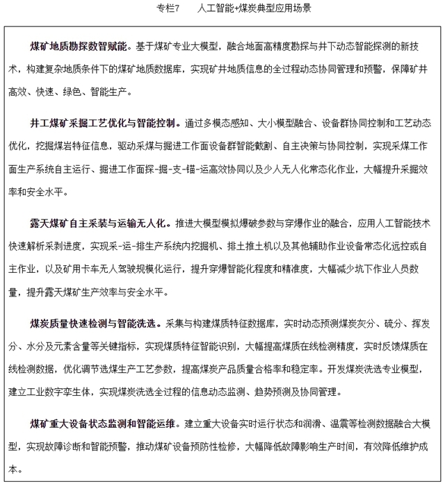 (七)人工智能+煤炭。聚焦地质勘探、煤矿采掘(剥)、煤炭洗选、生产调度、安全管控、设备管理等典型场景,稳定获取复杂地质、多工况以及多时空协同条件下的各种工况数据,融合应用智能模型,实现生产过程智能控制与自主决策,助力少人无人化作业常态化运行,稳步推进减人、增安、提效,进一步夯实煤炭在能源安全中的兜底保障作用。